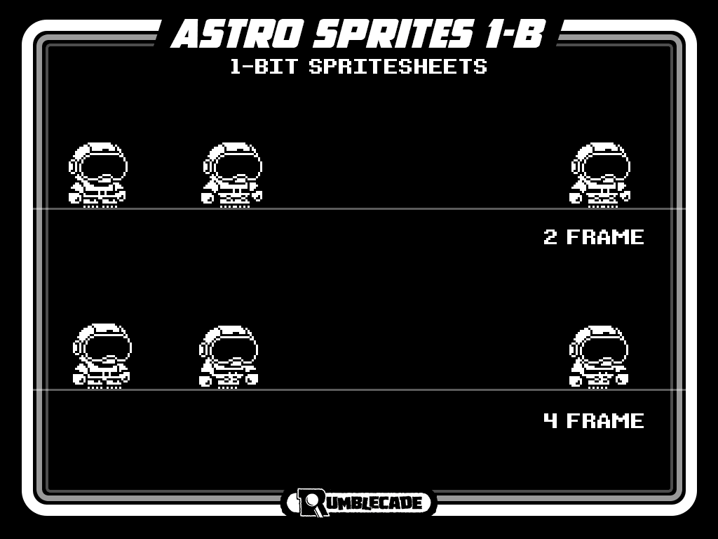 Please note that the frame count for these sprites is purposefully limited in keeping with the 1-bit style. This run cycle addition is intended solely for the astronaut; while we may add additional enemy sprites in the future, no increased frame counts for the existing sprites are planned.